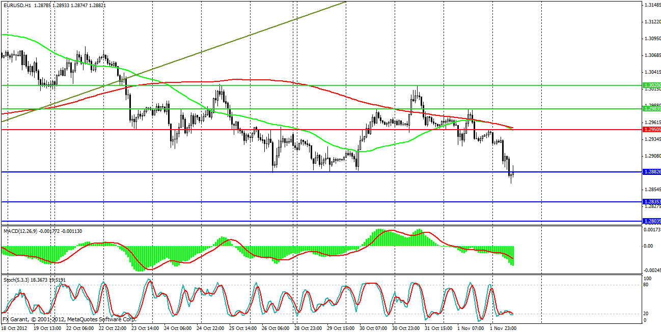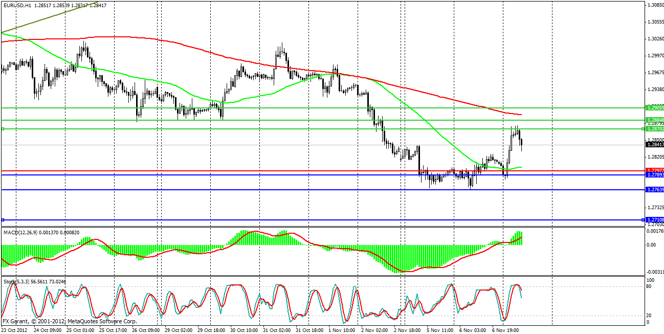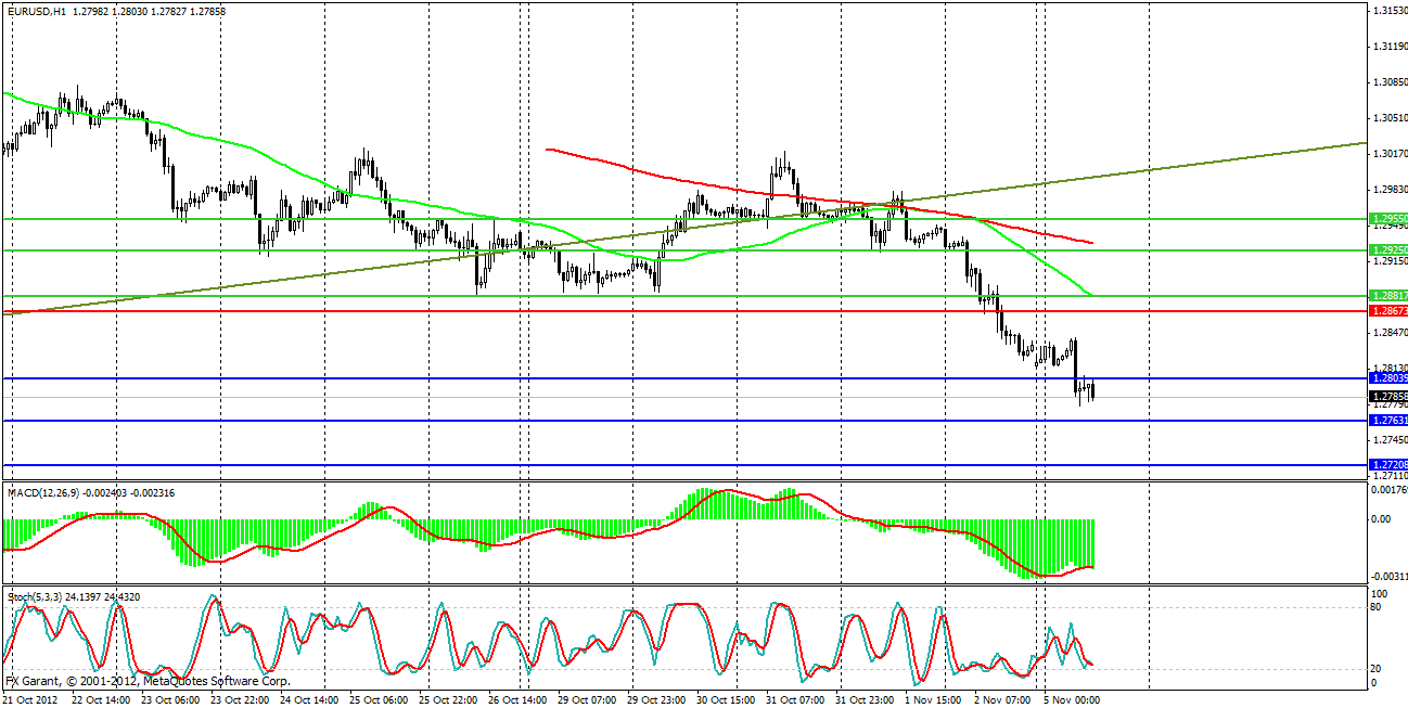 Торги открылись на уровне пятничного закрытия 1,2830, после чего пара продолжило нисходящие движение в завершении азиатской сессии. Пятничные данные по безработице в США, показали хороший результат, превысив прогнозы и ожидания аналитиков, однако при более детальном анализе данные по безработице говорят о по-прежнему неопределенной ситуации на рынке труда США. Накануне завтрашних президентских выборов в США пара EUR\USD останется в торгуемом диапазоне последней недели.