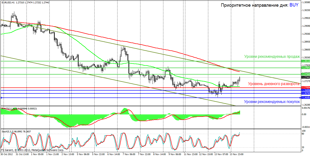Технический анализ сегодня представляет собой следующие. Уровнем дневного разворота выступит цена – 1,2741. Приоритетным направлением дня остается по прежнему BUY. Цели для покупок не значительно изменились со вчерашнего дня, ими выступят уровни – 1,2720, 1,2701, 1,2680 (BUY). Уровнями сопротивления выступят уровни – 1,2829, 1,2876, 1,2905 (SELL). Рассматривать продажи в ходе сегодняшних торгов крайне не рекомендуется.
