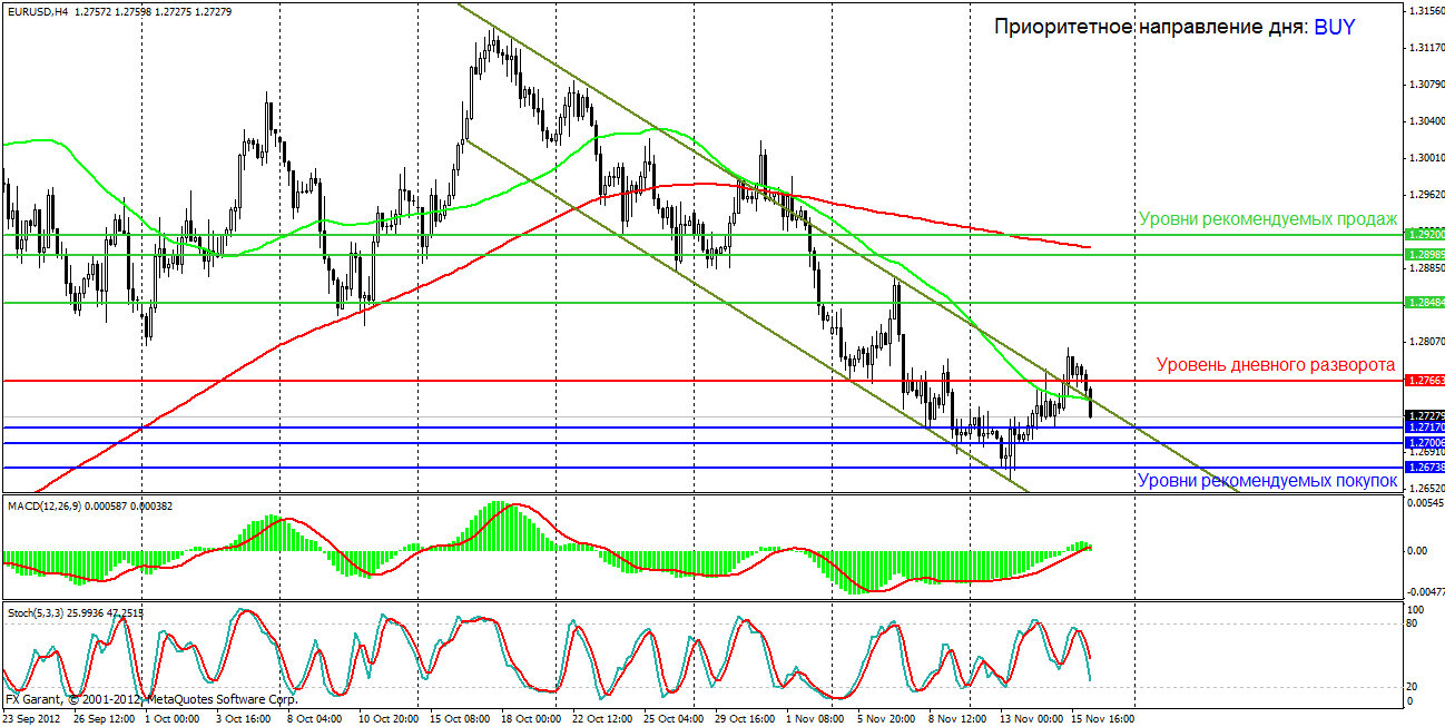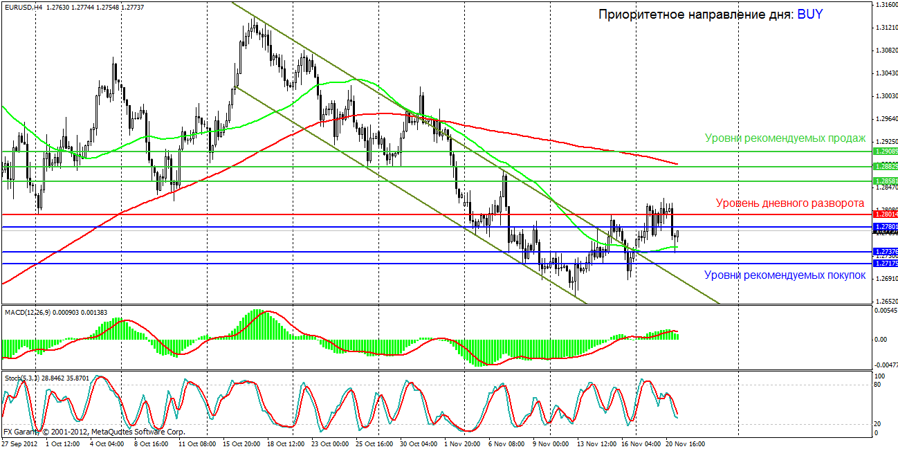 Как и предполагалось, вчерашнее заседание министров финансов ЕС, не дало никакого результата относительно Греции. Отсутствие решения по предоставлению финансовой помощи, значительно ослабило позиции евровалюты, обновив локальный минимум 1,2735. Решение «греческого вопроса» переносится на понедельник 26 ноября, когда министры финансов Евросоюза вновь соберутся по этому поводу, т.к. в ходе вчерашнего заседания появился ряд сложных технических вопросов, решение которых требует повторной встречи.