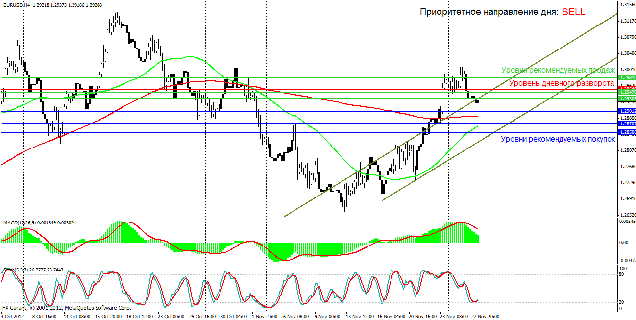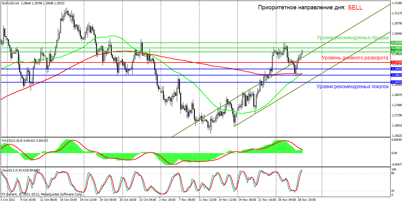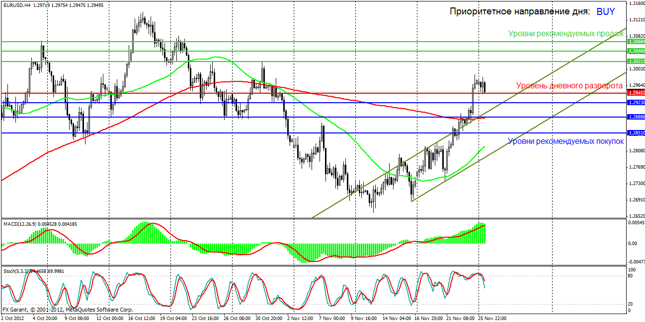 Вчерашние торги на рынках слабо отреагировали на новости из Евросоюза касательно принятия решения оказания помощи Греции. Американский доллар временно укрепил свои позиции, обновив локальный минимум 1,2915. Еще полностью не оконченное, но тем не менее принятое политическое решение касательно Греции, скажется в ближайшее время на росте евровалюты, тем самым делая этот вопрос второстепенным для рынков. Основной вопрос, который выходит теперь на повестку дня - переговоры между представителями республиканской и демократической партий США, касательно принятия нового бюджета, сторонам необходимо достигнуть консенсуса в отношении «финансового обрыва» грозящего Соединенным Штатом с началом 2013 года. Относительное затишье последней недели в этом вопросе, было связано с празднованием Дня Благодарения, начало нового месяца обещает быть достаточно бурным, т.к. представителям обоих партий придется пойти на значительные уступки дабы предотвратить дальнейшие повышение налогов, которое незамедлительно ввергнет страну в рецессию.