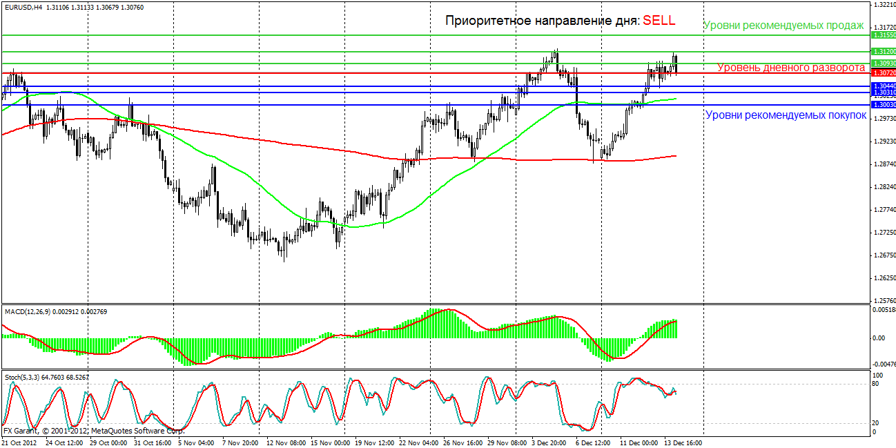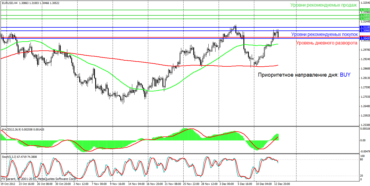 Евровалюта оправдала вчерашний прогноз продолжив укреплять свои позиции и вновь протестировала уровень 1,3120, который так и не был преодолен. На американский доллар по прежнему оказывает негативное воздействие касательно бюджетных проблем США, евровалюте же поддержку оказала договоренность представителей Еврогруппы касательно создания единого европейского банковского регулятора на Европейского Центрального Банка. ЕЦБ получил полномочия напрямую вмешиваться в деятельность наиболее крупных европейских банков, которые дадут на это свое согласие, второстепенные банки смогут обратиться за подобным вмешательством в случае возникновения проблем. Рынки не отреагировали на положительную статистику из США по рынку труда, количество заявок на пособие по безработице сократилось до 343 000, показав лучший результат чем ожидаемые 372 000 тысячи.