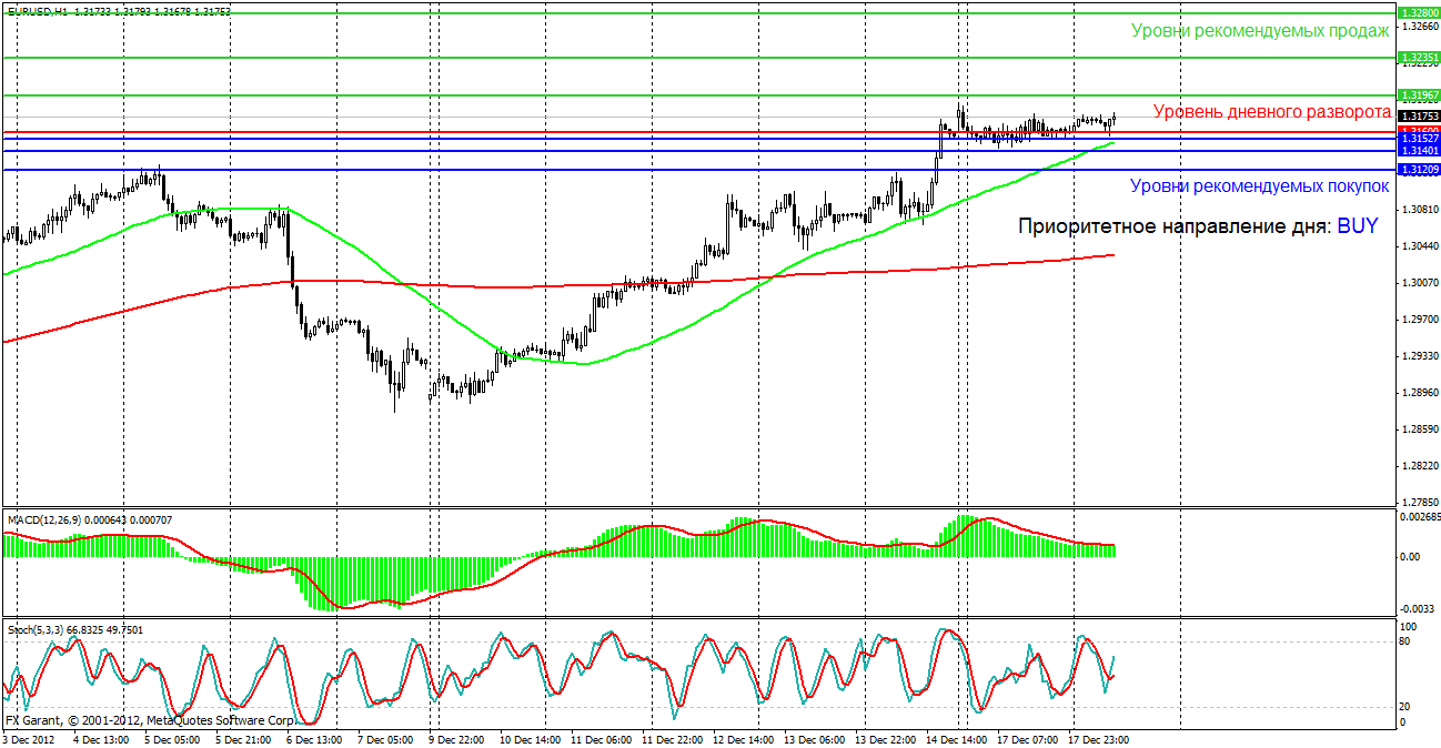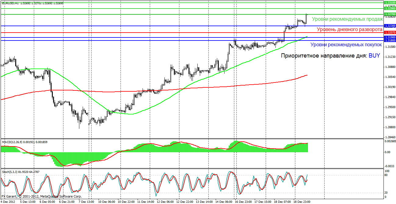 С началом азиатской сессии американский доллар значительно укрепил свои позиции, тем самым оправдав полностью вчерашний прогноз, обновив локальный минимум на уровне 1,3180, после чего пара EUR\USD ушла на коррекцию. Решение касательно «финансового обрыва» до сих пор не дало, каких либо значимых результатов, так называемый план «Б» Джона Бонера был отложен республиканцами. Дальнейшие голосование по этому вопросу было перенесено на 27 декабря, тем самым оттягивая решение вопроса до последнего, создавая на рынках дополнительное напряжение.