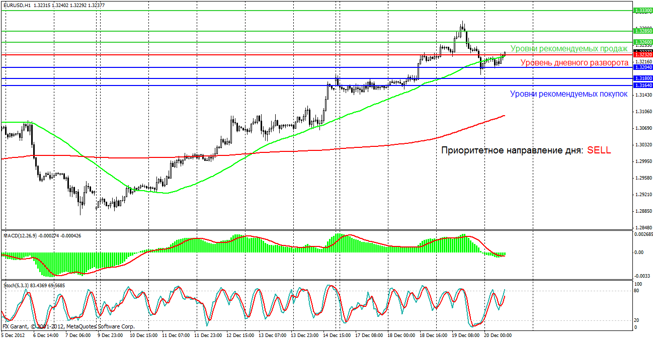 Уровнем дневного разворота является цена – 1,3240. Приоритетным направлением дня по прежнему выступает SELL. Позиции набранные на продажу в ходе торгов 19 и 20 декабря, рекомендуется держать открытыми, дополнительные продажи в случае коррекционного движения рекомендуется рассматривать от уровней - 1,3252, 1,3280, 1,3320 (SELL). Так же продажи возможны от уровня дневного разворота 1,3240.