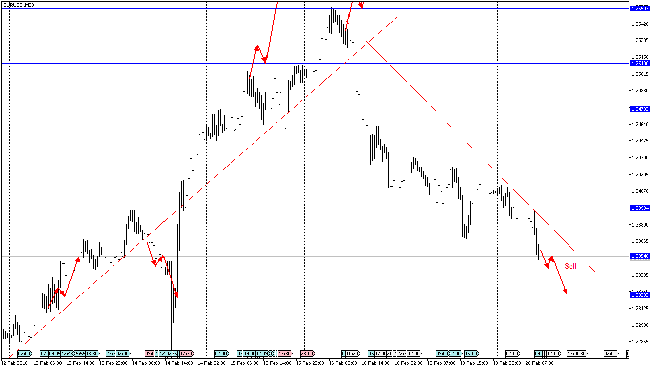 EUR/USD (Продавать) - Хорошая нисходящая тенденция. Если цена пробьет и закрепится ниже 1,23550, стоит продавать пару. Цель 1,23230. Стоп 250 пунктов.