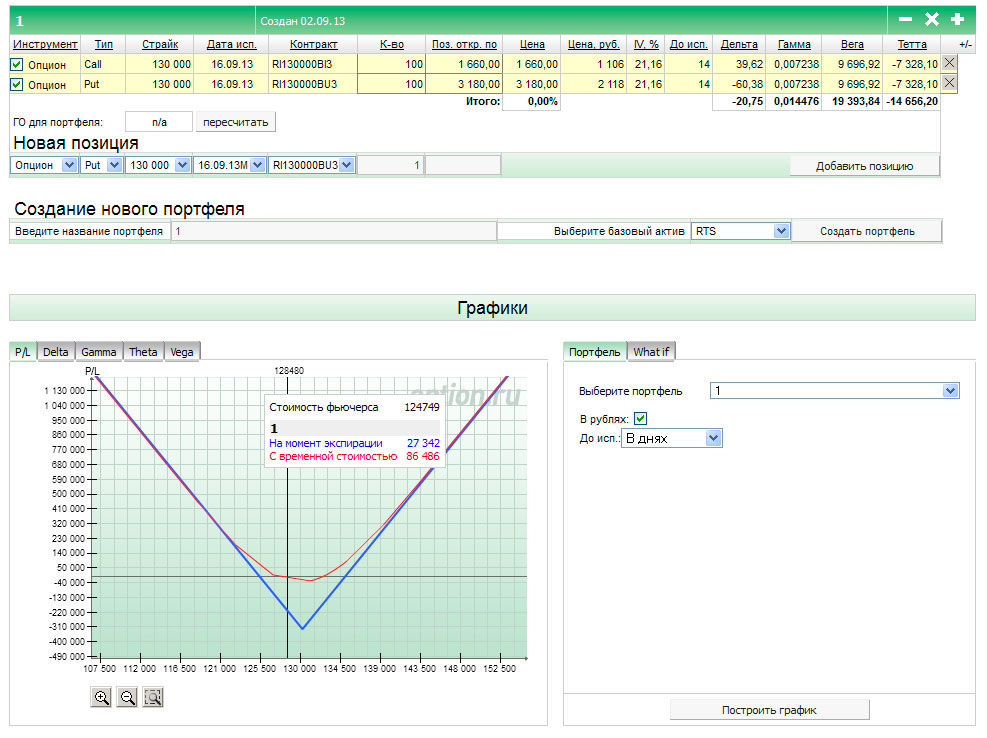 Назревает времена перемен в начале сентября 2013 года, опционы истекают через 14 дней, поэтому предлагаю купить стредл или стренгл от центрального страйка 130 000. Волатильность в ближайшие дни выстрелит до 25-28 по VX, РТС уйдет на 126000, поэтому есть смысл формировать портфель из опционов колл и пут 130 страйка в длинную позицию с ожиданием на 2-5 дней
