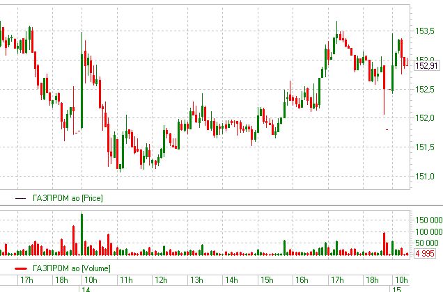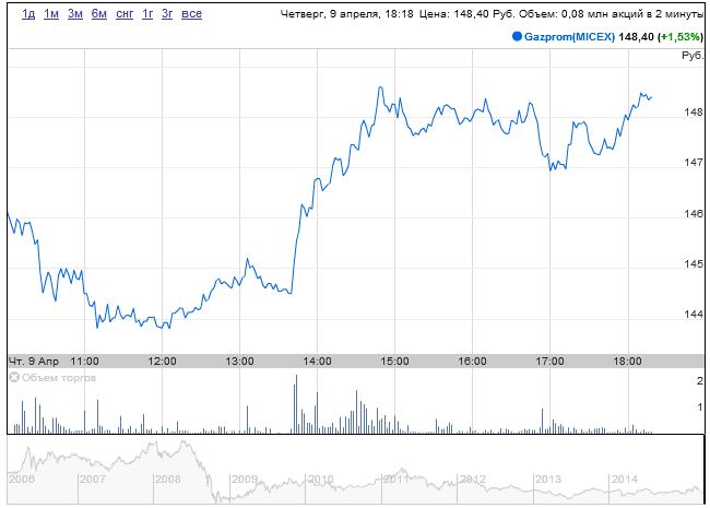 Несмотря на то, что на фоне укрепления рубля сегодня рынок закрылся в значительном минусе, акции Газпрома закрыли торги в положительной зеленой зоне, взлетев на сообщении о дивидендах за 2014 год. Как сообщалось ранее, дивиденды могут быть такие же как за 2013 и составлять 7.2р на 1 акцию, что является примерно 5% доходностью в годовых.