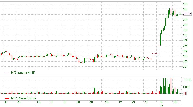 Торги в среду 15 апреля 2015 года по бумагам МТС открылись ростом, в первые 10 минут торгов на ММВБ, акции торгуются с повышением на 3% по 261р.