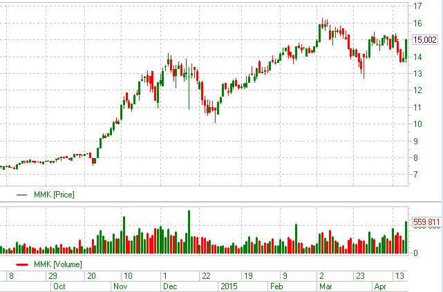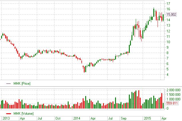 Сегодня второй день акции ММК находятся в лидерах роста на ММВБ, бумага делает +2.6% с оборотом на текущий момент в 370 млн.р. Участники рынка по прежнему не могут объяснить причины неожиданного роста, идет просто плавная скупка бумаг, в моментах огромными объемами в биржевом стакане