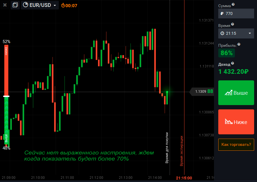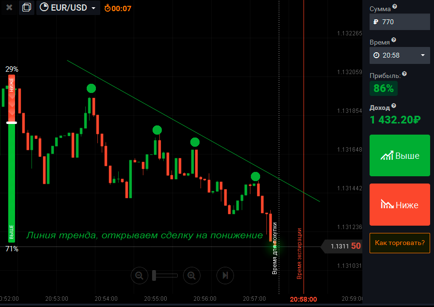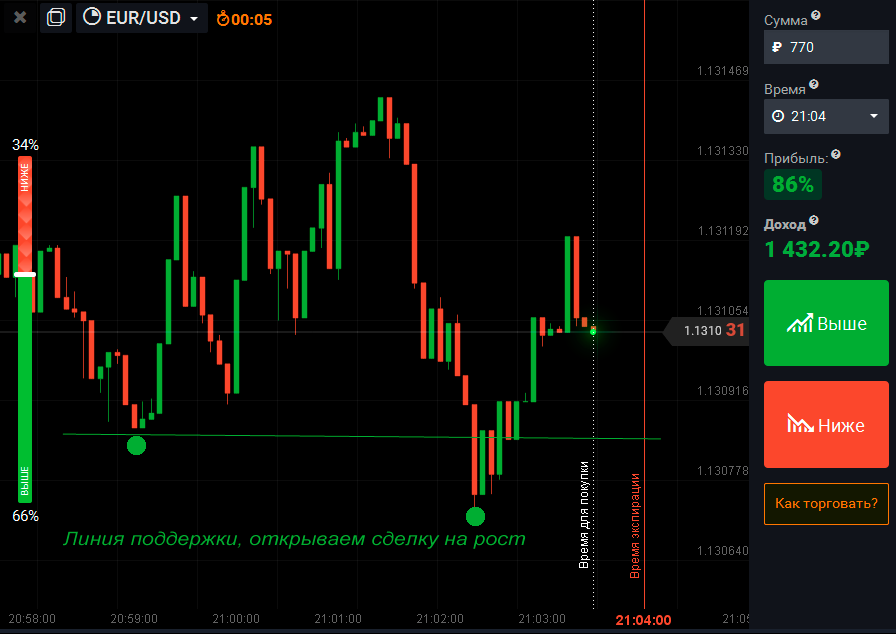 Так например, чаще всего наблюдая за работой профессионального трейдера, можно услышать "сейчас пойдет вверх" и вдруг мы видим, что на рынке действительно развивается тенденция и движение по тренду продолжается. Суть этой стратегии в том, чтобы входить в позицию по тренду, который только зарождается и имеет потенциал движения в ближайшие 60 секунд. Очень важно входить на самом начале тренда (10-20% движения), только так, мы сможем с вероятностью 90% выйти из сделки с прибылью.