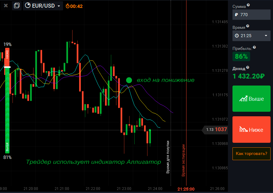 На изображении мы видим сигнал на продажу (кнопка "ниже"), линии аллигатора пересеклись и раскрылись в направлении предполагаемого нового тренда, поэтому трейдер открывает сделку на понижение. также существуют платные изысканные индикаторы, авторы которых, обещают большую прибыль при работе с их софтом. Я отношусь к ним скептически, так как есть два правила: курицу несущую золотые яйца никто не продаст и второе правило - все гениальное просто. Пробуйте торговать используя бесплатные индикаторы, они в себе содержат столетние технические принципы торговли на финансовых рынках