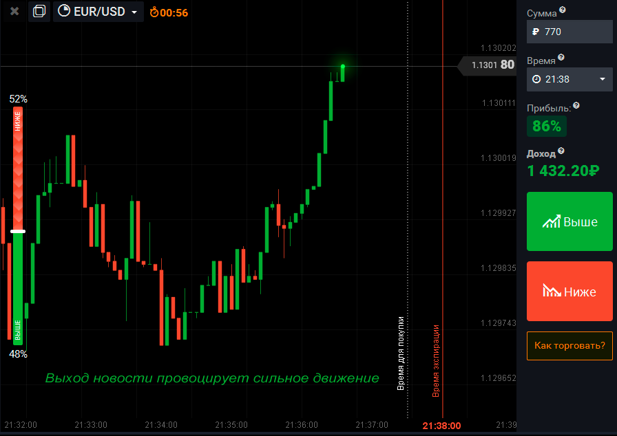 Во время выхода новости (первые секунды), мы наблюдаем хаотичное движение, которое выносит стопы обычных трейдеров и пипсовщиков на форексе, у трейдера бинарных опционов есть преимущество, у него нет стопа, но ему нужно, чтобы сценарий сработал, через 60 секунд. Внимательно отслеживайте время выхода важных экономических показателей, это позволит вам поймать хороший тренд или заработать на резких колебаниях