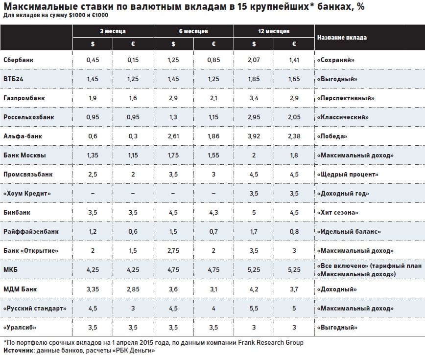 Доходность вкладов в валюте падает, как и ставки по рублевым депозитам. За прошедший месяц ставки по годовым депозитам в долларах 15 крупнейших по объему вкладов банков упали в среднем с 4,02 до 3,46%. Больше всего снизилась доходность по краткосрочным вкладам — на три и шесть месяцев. При этом ставки по депозитам в евро опустились сильнее, чем проценты по долларовым вкладам.