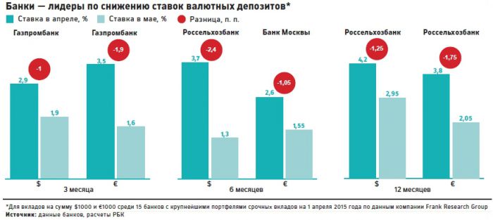 Сильнее всего за это время понизил доходность вкладов Россельхозбанк: он опустил ставки по вкладам на полгода более чем на 2 п.п. Еще в апреле сумму $1000 можно было положить в этот банк под 3,7% годовых, а в мае — уже под 1,3% годовых.