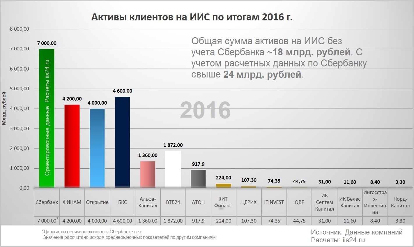 Вот нашел интересную статистику по активам клиентов на ИИС, Сбербанк лидирует, но данные взяты из воздуха, так как реальной статистики Сбербанк не представляет