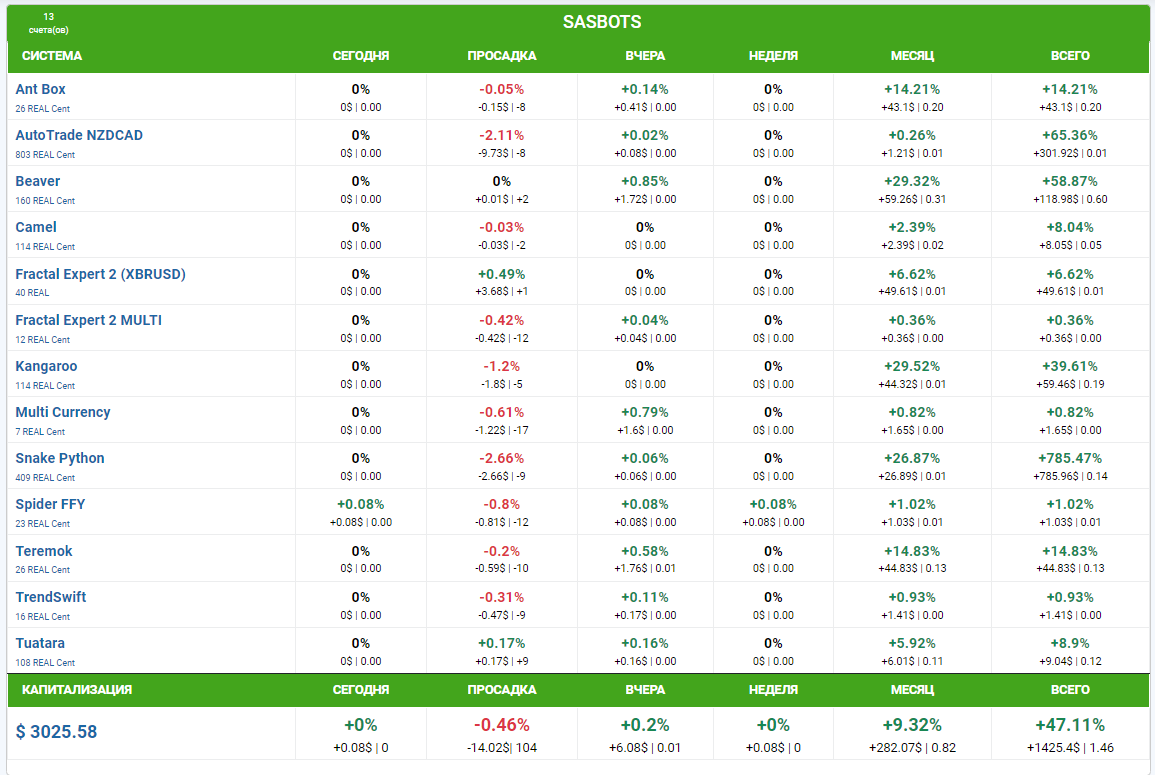 На данный момент торговых роботов 6, они комбинируются в портфеле с разными настройками и с разными валютными парами, уже запущено 13 счетов (портфелей), большинство из них можно копировать.