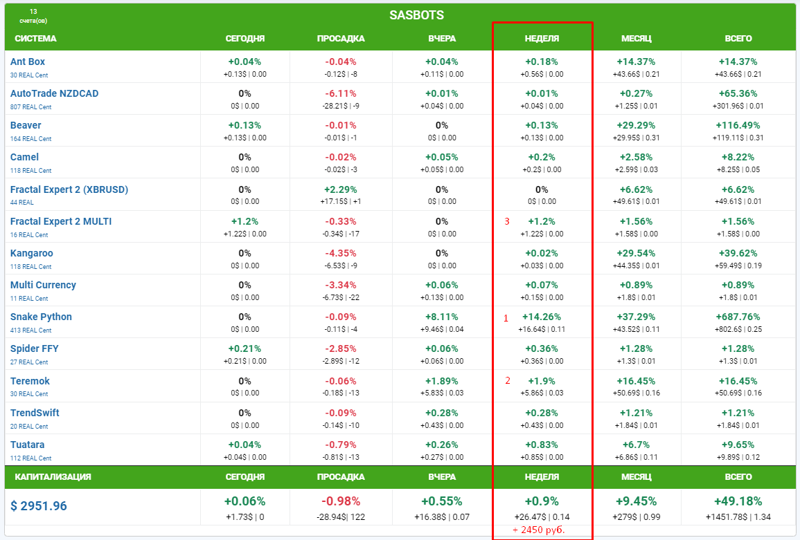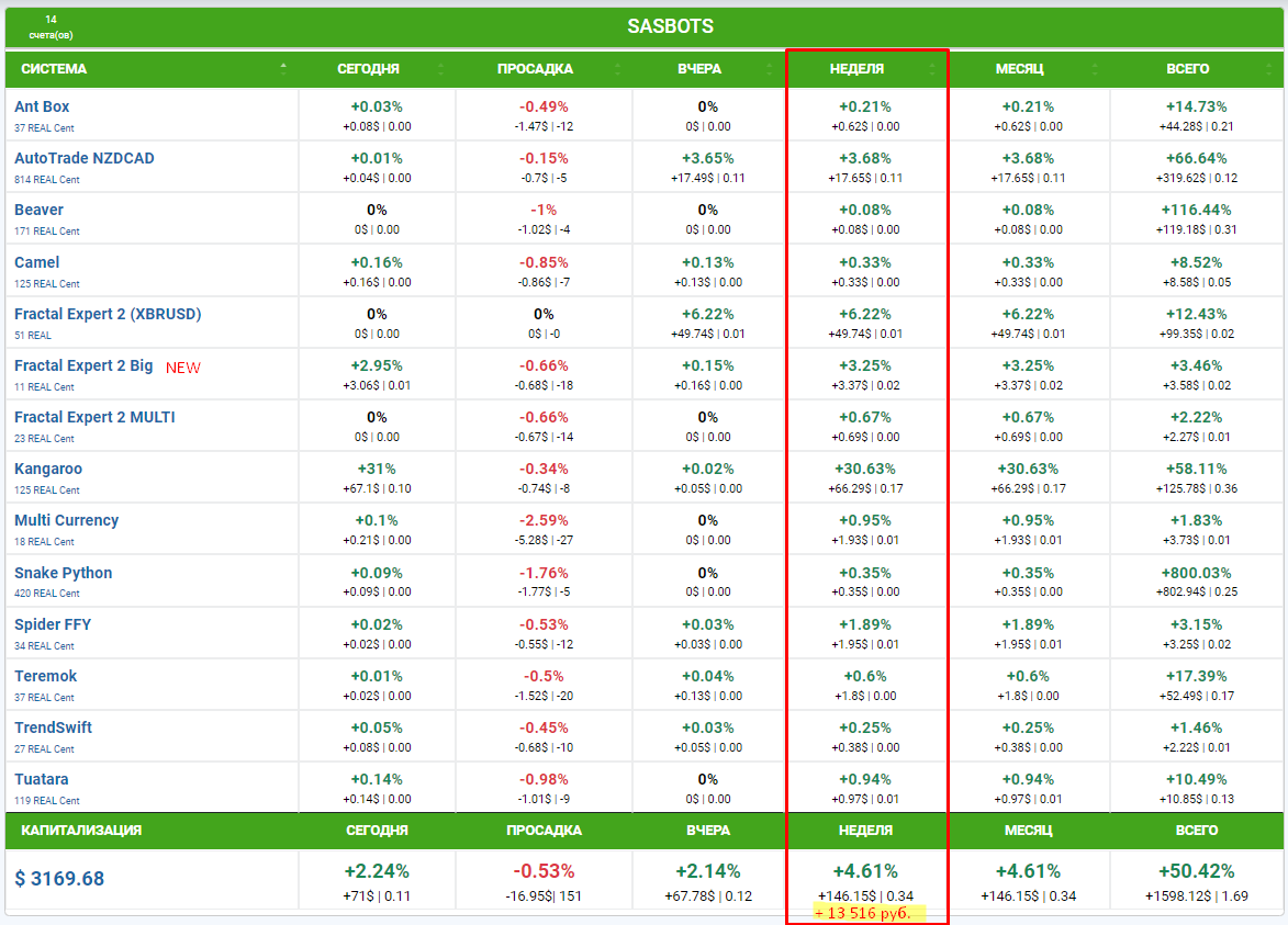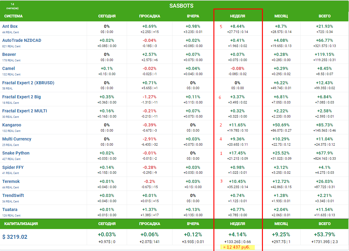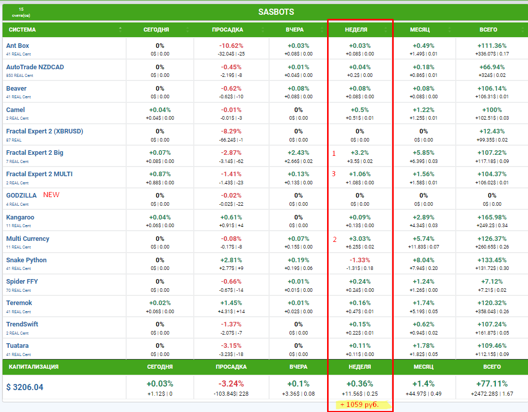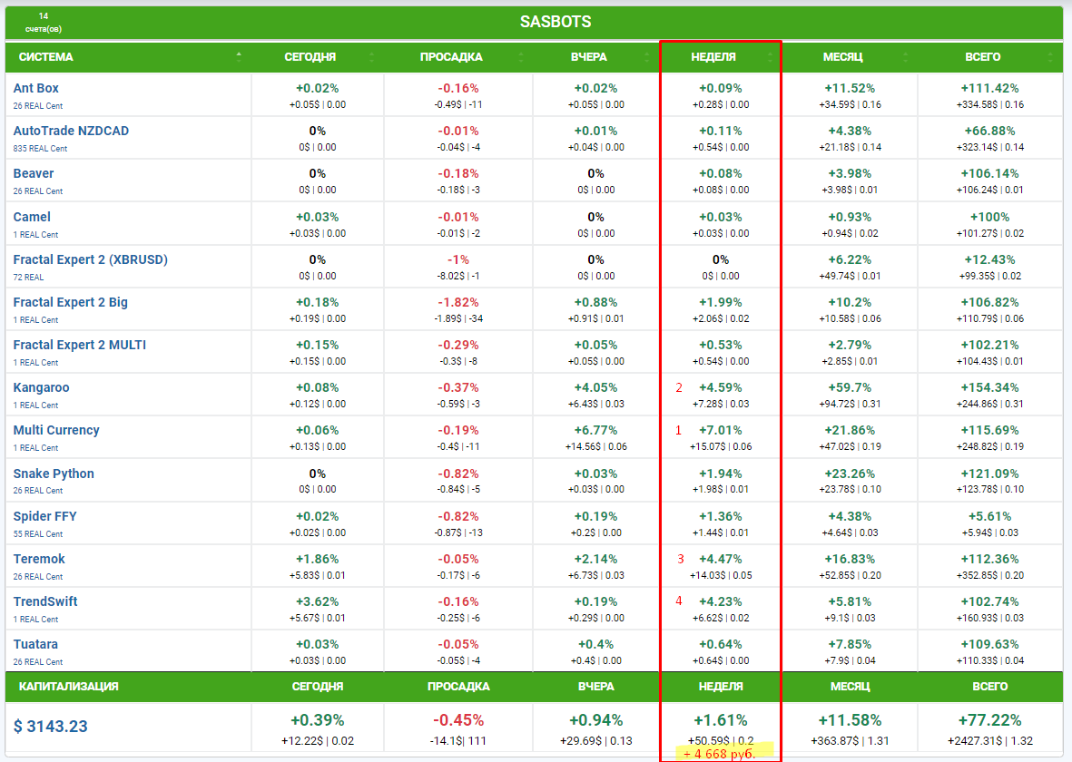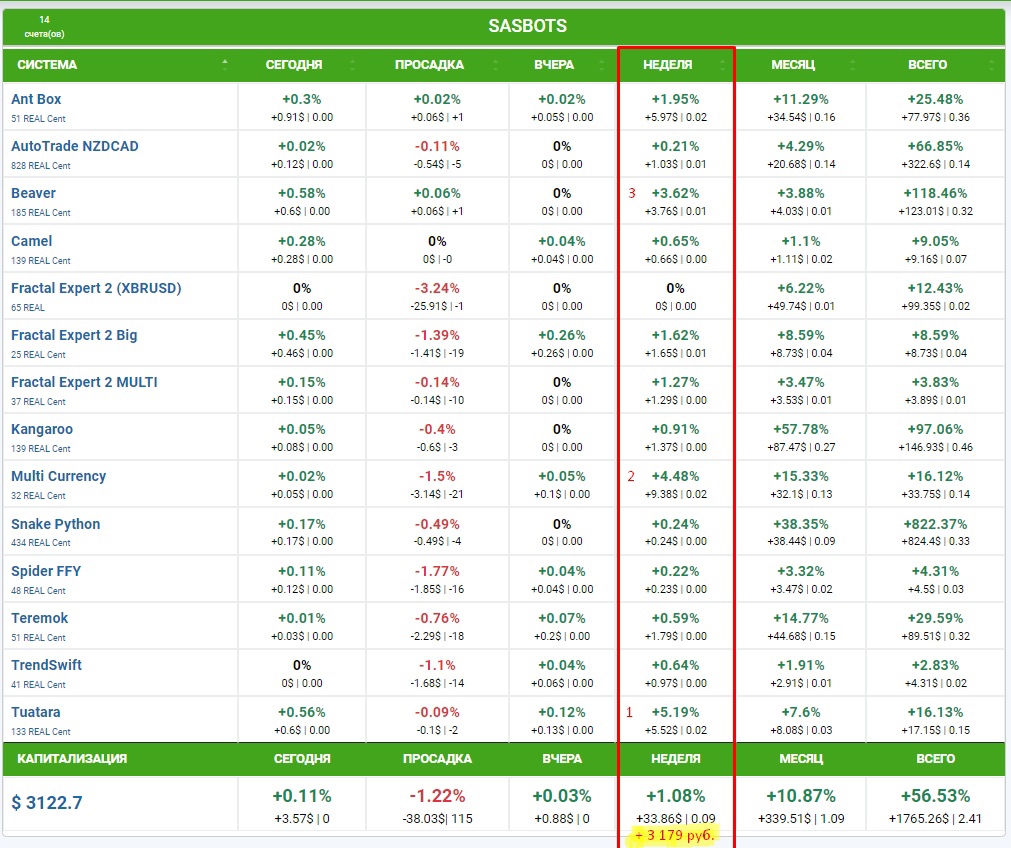 На этой неделе отличились совсем другие роботы, те, которые очень редко попадают в топ, а это значит что диверсификация по роботам, работает: