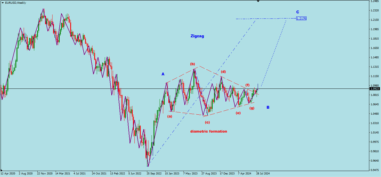 Волну {D}, нейтрального треугольника, размечаю, как зигзаг А-В-С. С диаметриком в позиции волны В. Если смотреть перспективу движения через точку вращения диаметрика, то попадаем в область ~ 1.2176 ... что практически совпадает с целями месячного графика.