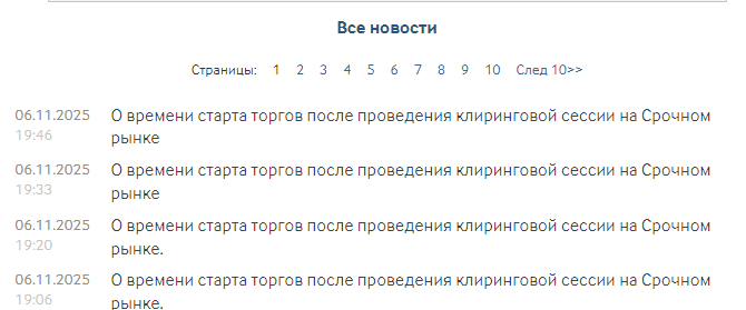 06 ноября 2025 года, торги на Московской бирже срочной секции должны были начаться в 19:05, в 19:06 на сайте биржи опубликовали сообщение о переносе запуска торгов на 19:20. После было решено перенести на 19:35, далее в 19:33 вышла новость о переносе старта торгов на срочном рынке на 19:50.
